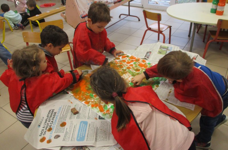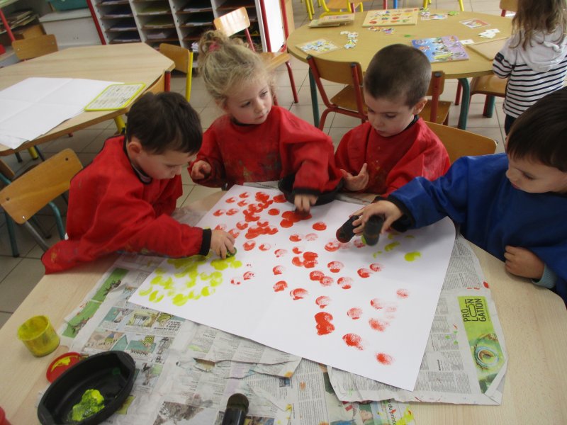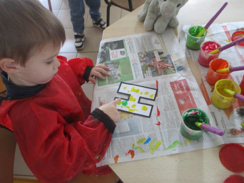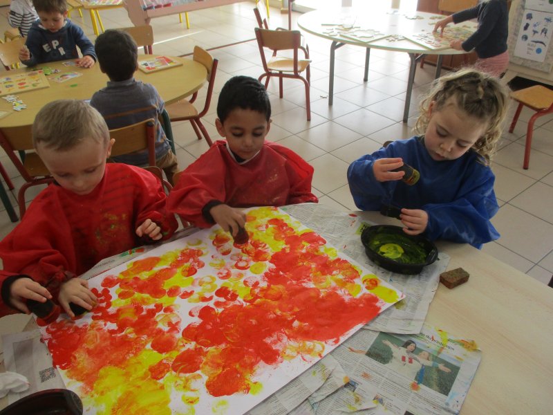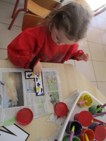 Nous avons peint les 4 fonds à l’éponge par équipe. Nous avons ensuite décoré notre initiale au doigt avec 2 couleurs au choix.