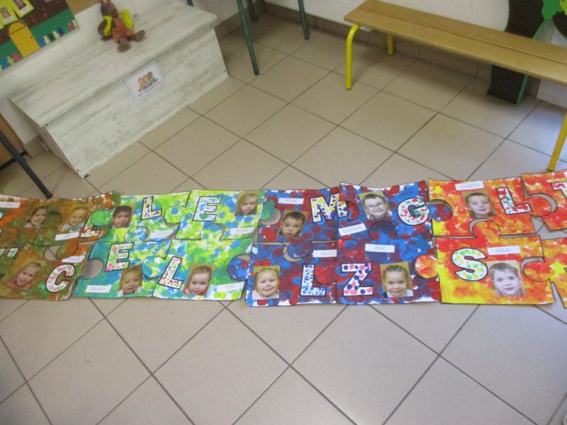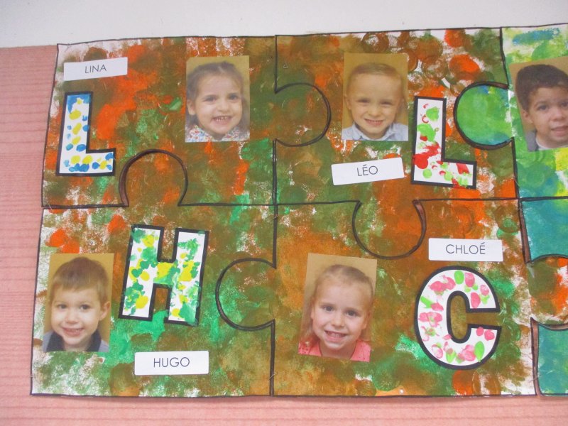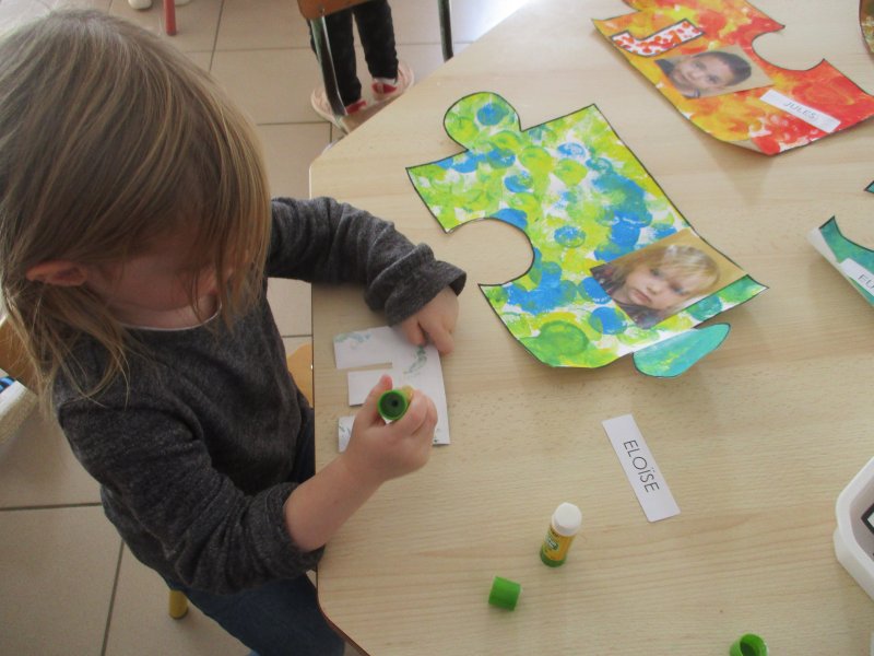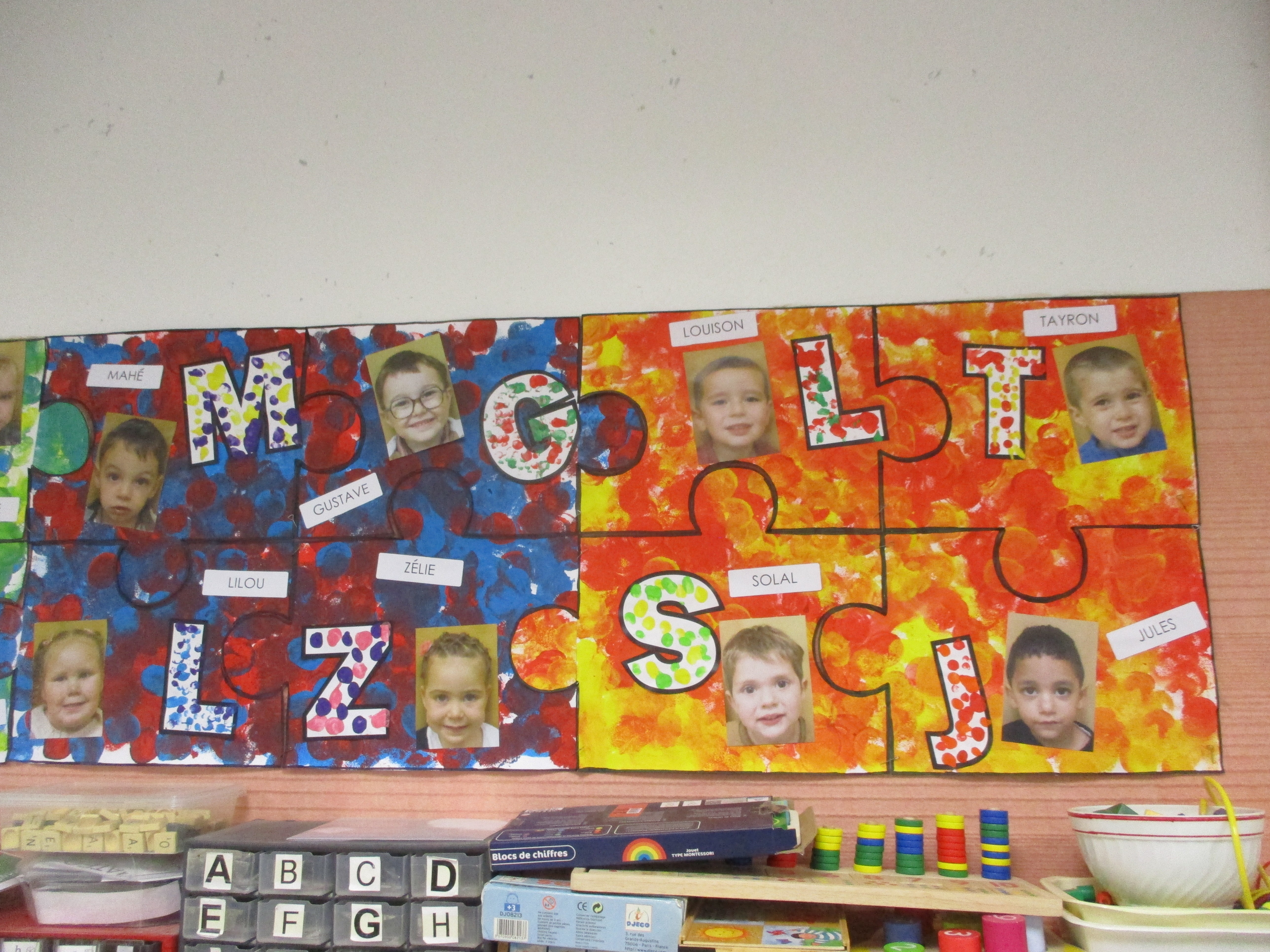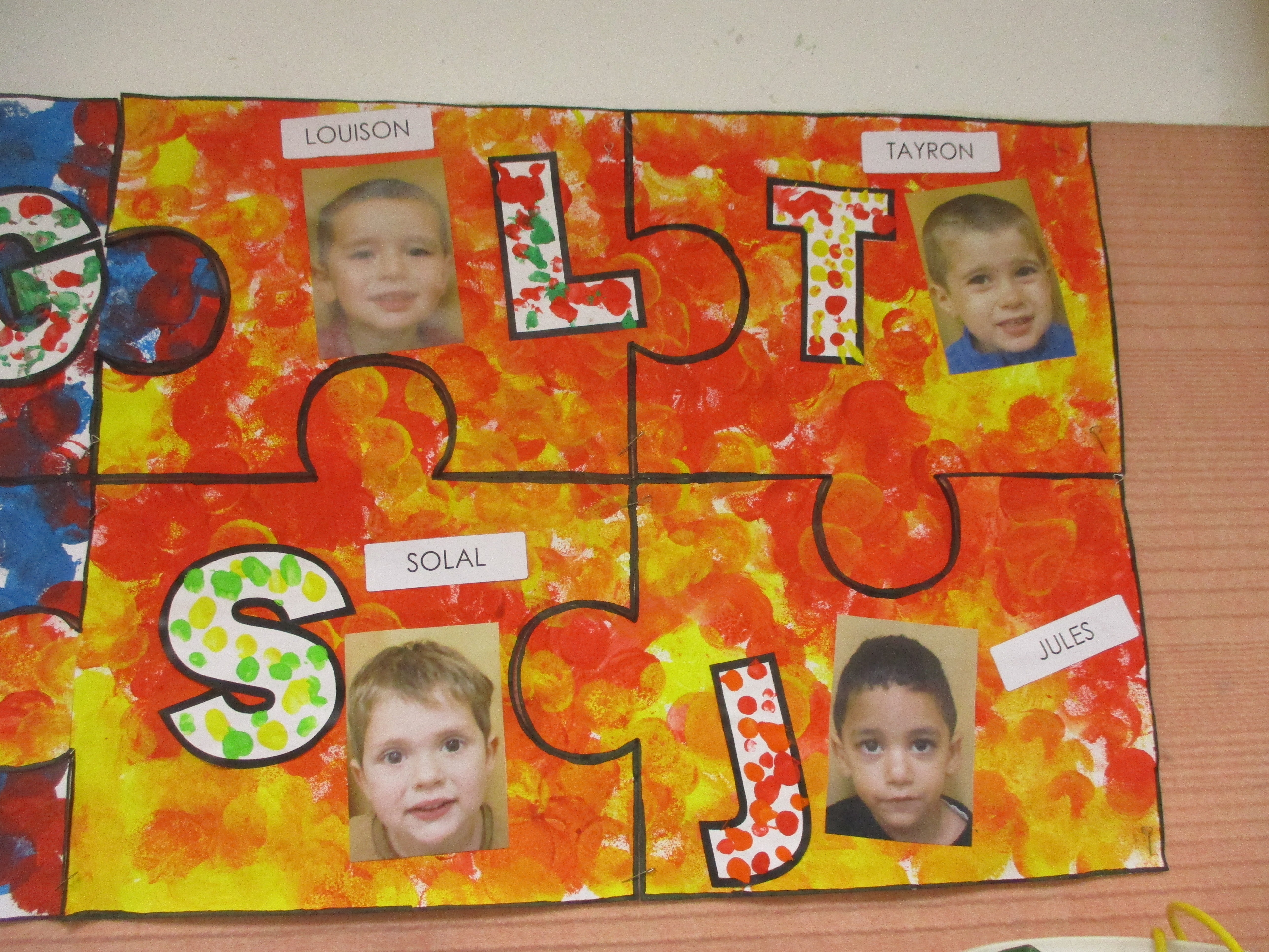 Puis la maîtresse a tracé et découpé les pièces de puzzle, nous avons alors choisi librement un morceau chacun, et nous avons collé dessus notre photo, notre initiale et notre prénom.