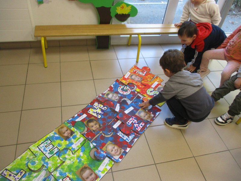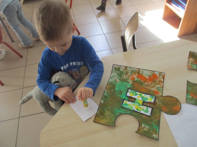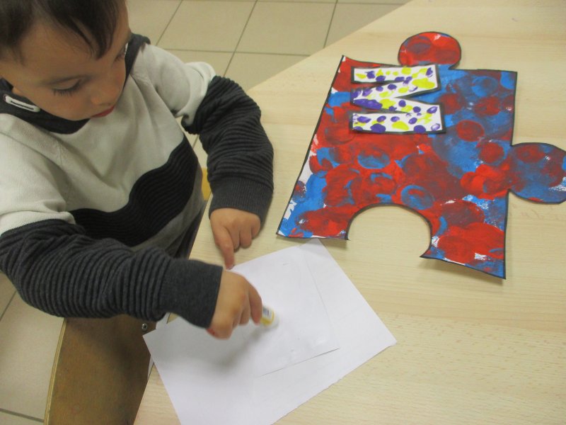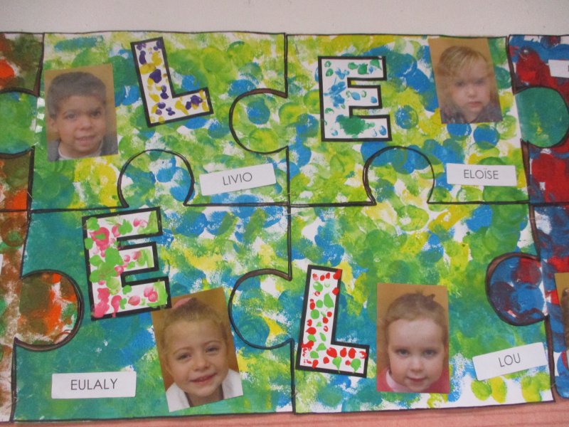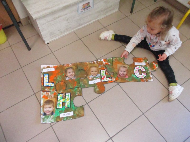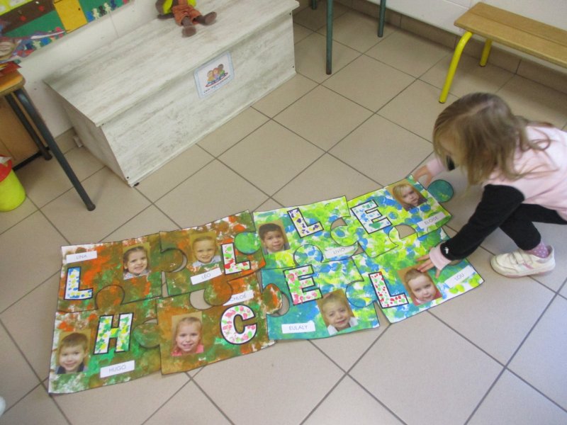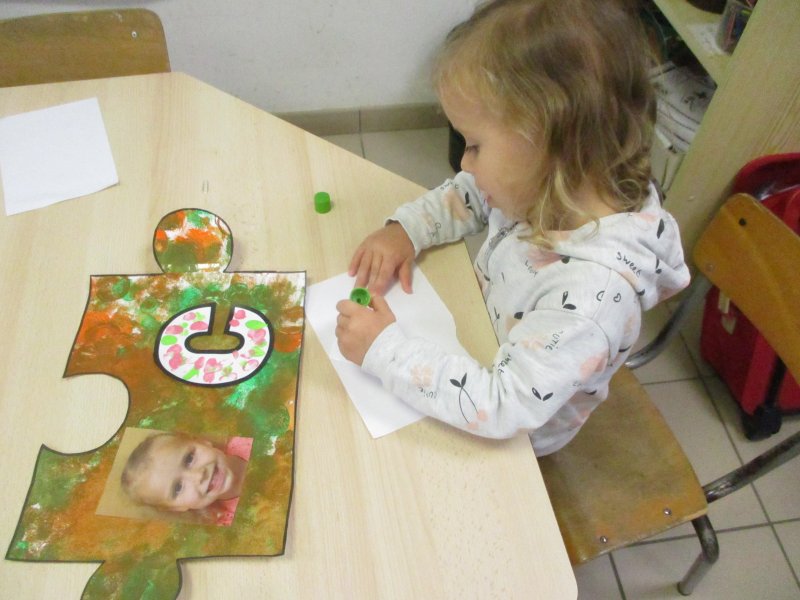 Puis la maîtresse a tracé et découpé les pièces de puzzle, nous avons alors choisi librement un morceau chacun, et nous avons collé dessus notre photo, notre initiale et notre prénom.