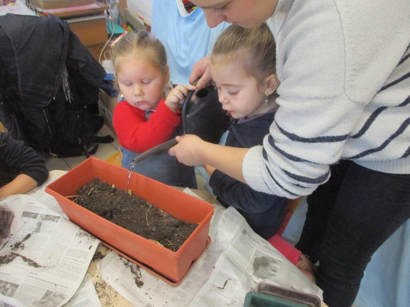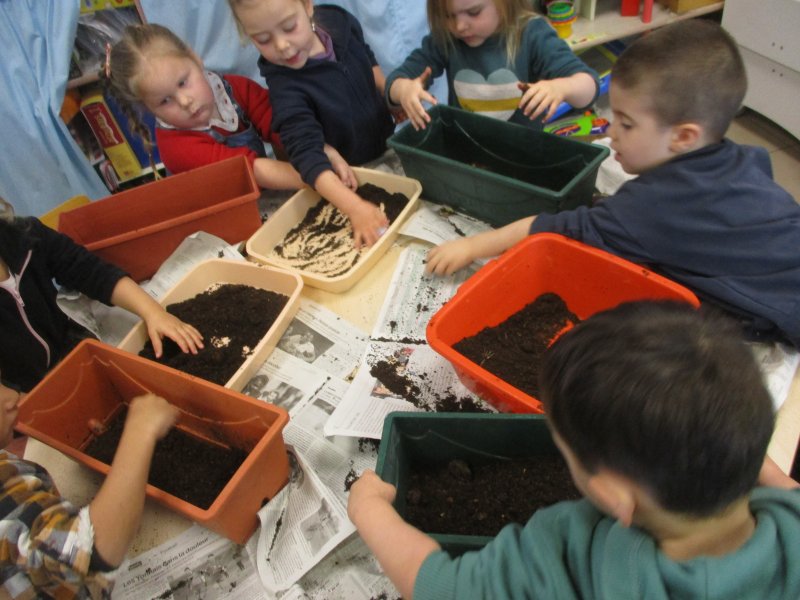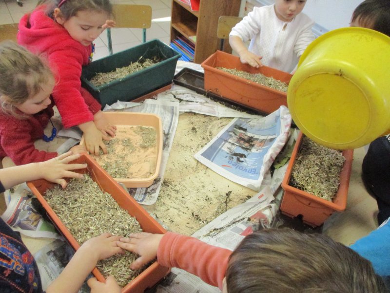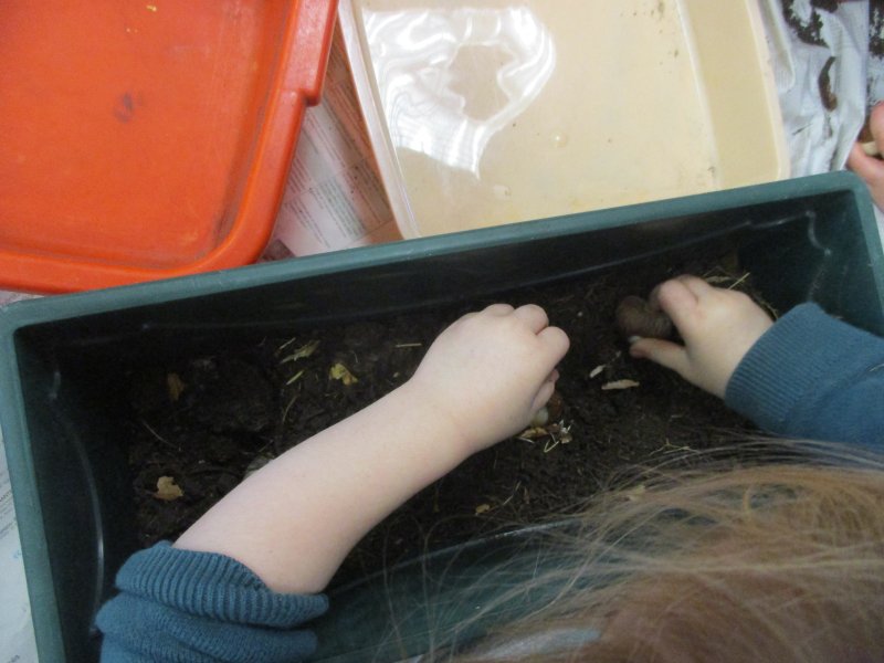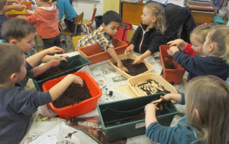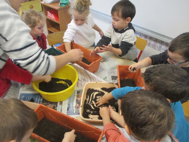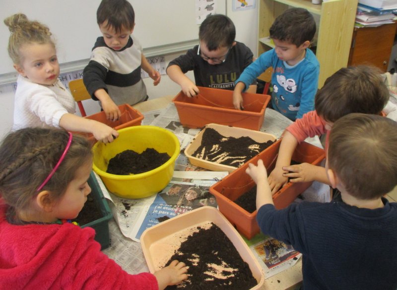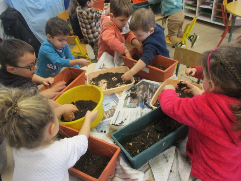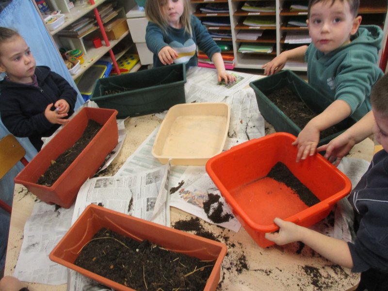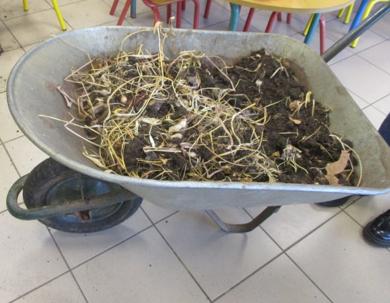 Nous avons d’abord mis du terreau, puis nous avons fait de petits trous et placé les bulbes dans le bon sens. Ensuite nous avons recouvert de terreau et nous avons arrosé. Enfin nous avons mis du paillage pour protéger les bulbes du froid car les jardinières seront disposées aux fenêtres de toutes les classes.