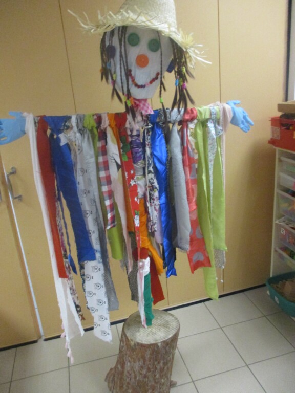 Voici différentes étapes de la réalisation de notre épouvantail dans notre classe de TPS-PS-MS. Nous avons commencé à accrocher des morceaux de tissus que nous avions emportés de la maison, sur la structure en bois. Nous avons ensuite rempli de paille une poche en plastique pour faire la tête. Nous y avons collé des bouchons