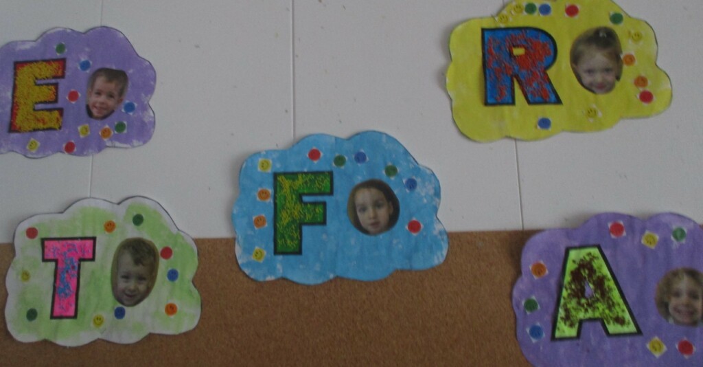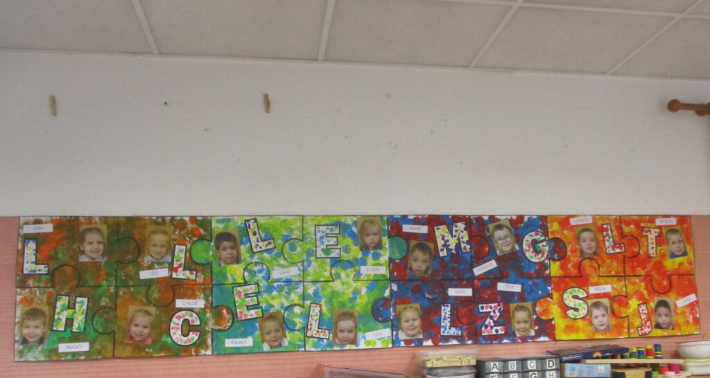 En MS, nous avons réalisé chacun une composition à partir de notre prénom. Nous avons collé des petits carrés de