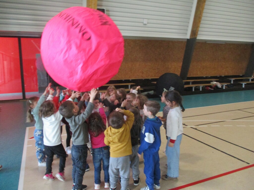 En motricité, le vendredi, nous manipulons un énorme ballon: le kin-ball. En PS-MS, nous faisons des jeux de coopération: faire