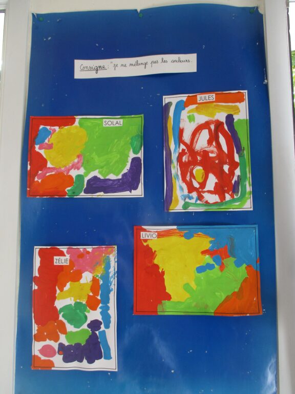 En septembre, nous avons réalisé des peintures au pinceau avec pour consigne « ne pas mélanger les couleurs ». Nous avons beaucoup
